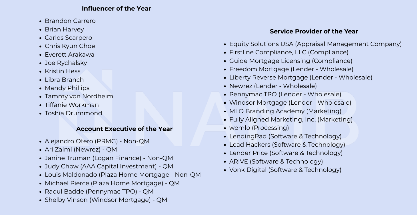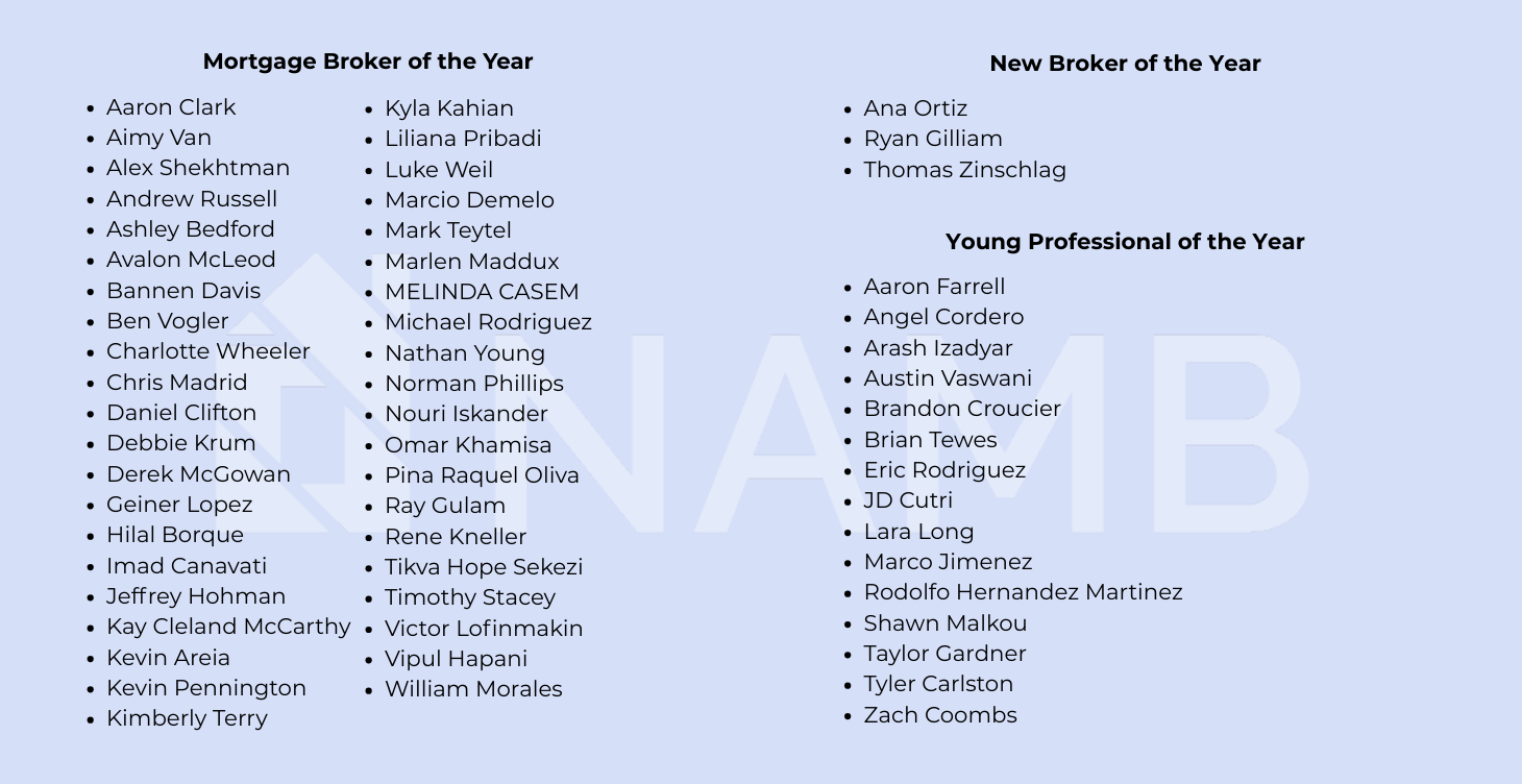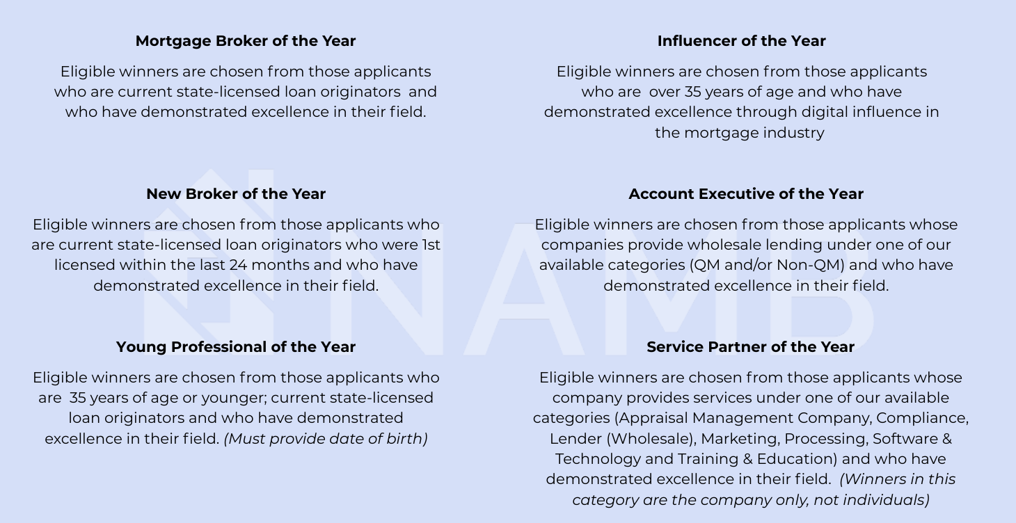 The National Association of Mortgage Brokers (NAMB) Recognition Awards are designed to honor and celebrate individuals and organizations that have demonstrated exceptional service, leadership, and commitment to the mortgage industry. While NAMB takes great care in the administration of the nomination and selection process, the following terms apply: